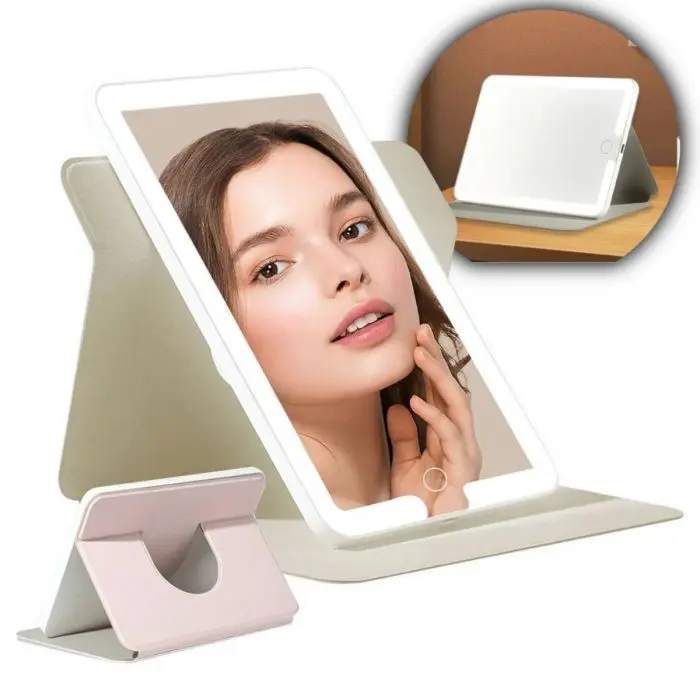 Este espejo con luz LED es ideal para maquillaje, cuidado facial o uso diario, brindando una iluminación ajustable y uniforme que se adapta a distintos entornos y necesidades. Su diseño moderno incluye un soporte giratorio de 360 grados, similar al de las tablets, que permite ajustar el ángulo con precisión.