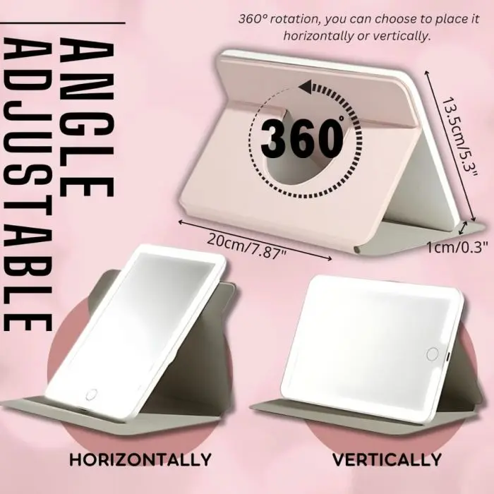 Soporte giratorio 360°: permite rotar el espejo libremente y fijarlo en la posición deseada. Práctico para mesas de maquillaje o escritorios.