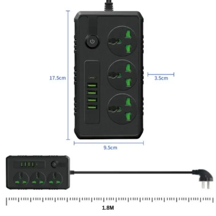 Cuenta con 3 tomas universales, 4 puertos USB y 1 puerto Tipo C para una conectividad total.